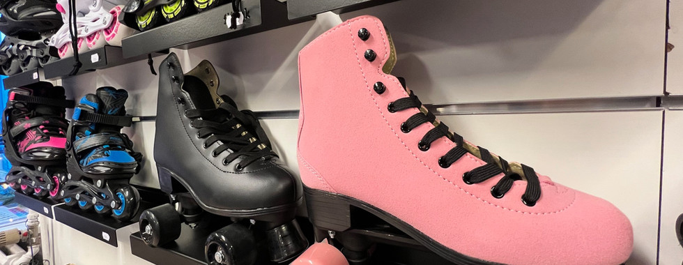 Í handlinum er stórt úrval av rennihjólum, rulliskoytum, rullifjalum og hjálmum í alskyns litum. (Trýst á myndirnar fyri at síggja tær størri.)